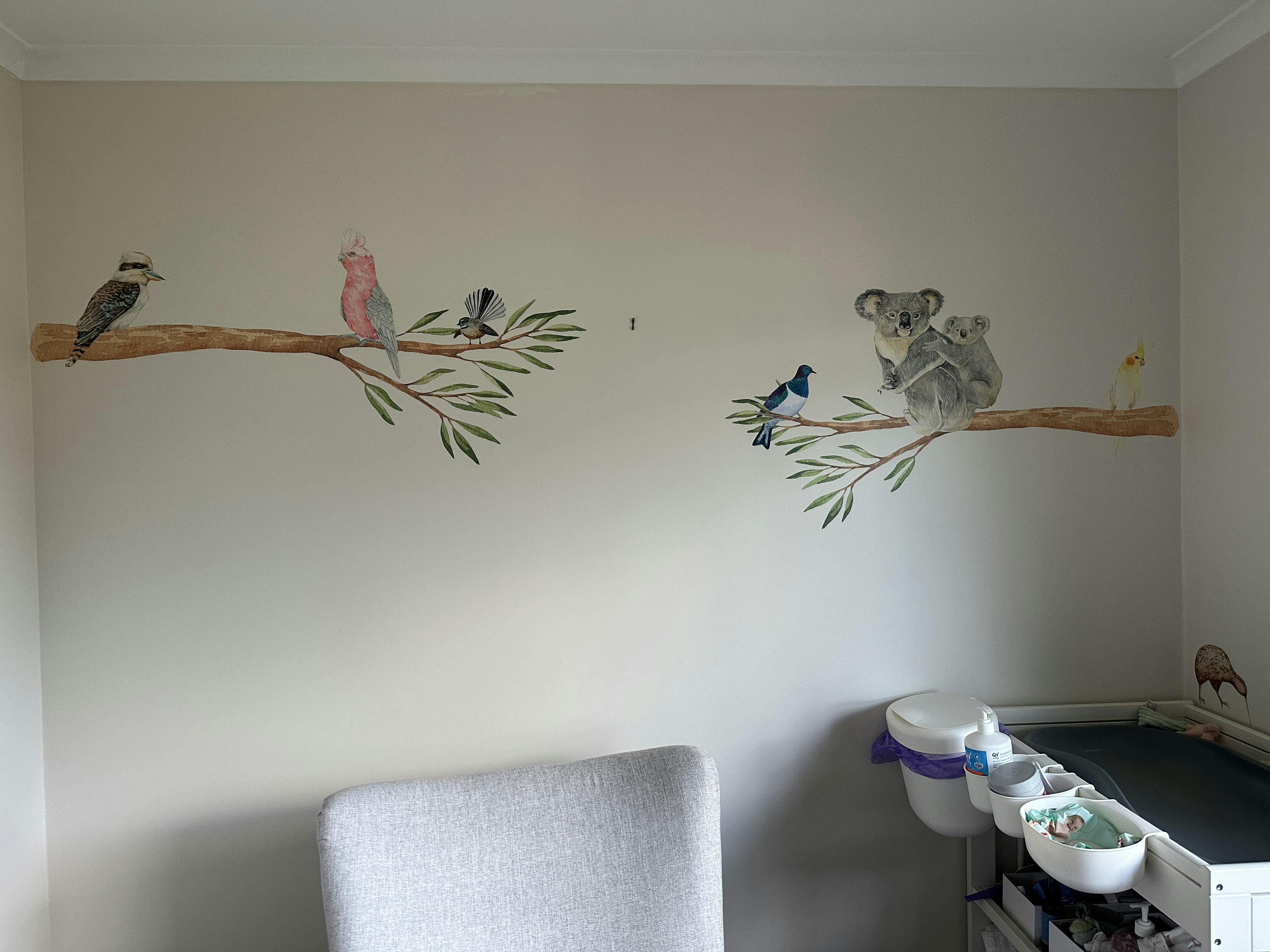 From the cheerful cockatiel to the elegant galah and the curious kookaburra, each bird adds colour, life, and character as they perch among the gum leaves. Perfect for nurseries, bedrooms, and playrooms, this collection transforms plain walls into a serene space filled with nature and imagination.