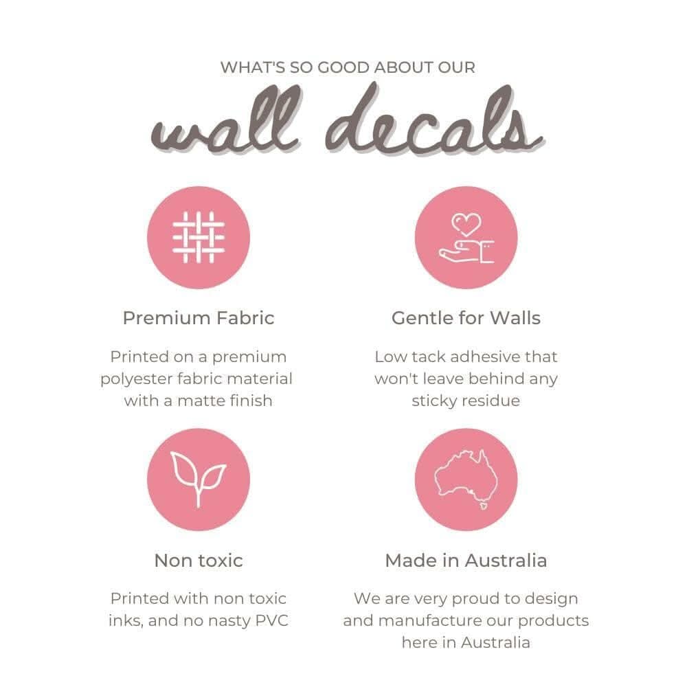 Our decals are printed on premium, non-toxic polyester fabric with a soft matte finish - never vinyl. They use a removable, water-based adhesive so you can reposition during install and peel away when you’re ready for a change.